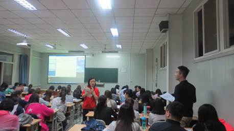 然后,胡老师以自己的教学实践为例,讲述了如何高效地推进小组探究式教学。在讲座中,胡老师结合初中英语八年级上册第五单元的具体案例,以讨论的方式与我院师范生一起对中学英语的听说及语法课型的教学方法和教学设计进行了分析。