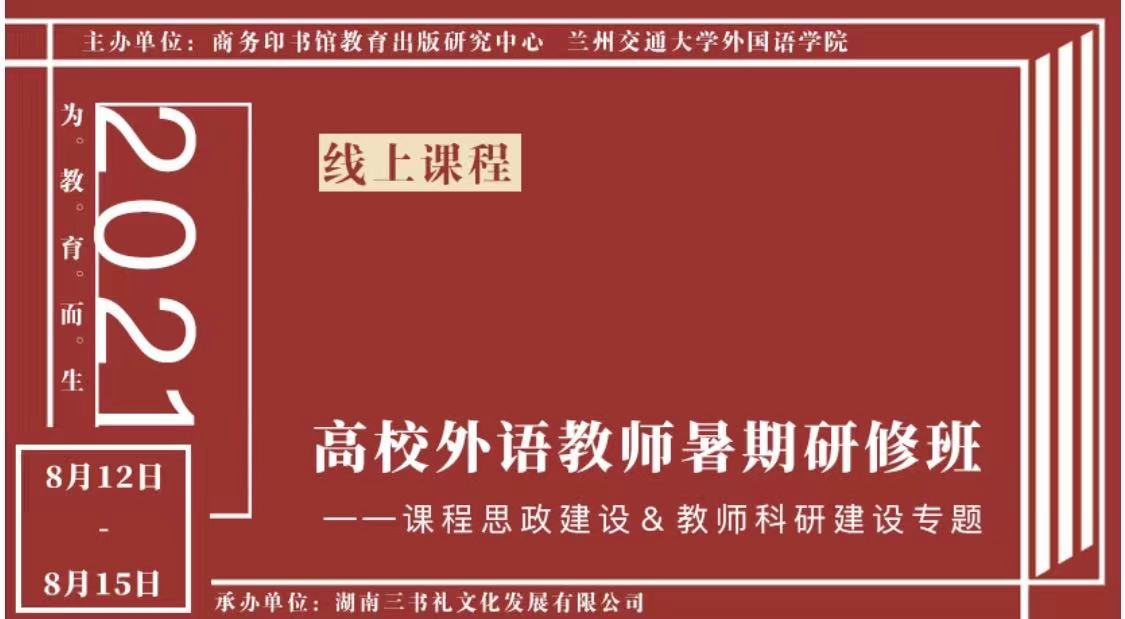 为深入贯彻党的教育方针,落实立德树人根本任务,提升教学科研水平和育人成效,商务印书馆教育出版研究中心与兰州交通大学外国语学院于2021年8月12日—15日联合主办“2021年高校外语教师暑期研修班”活动。本次会议主题为“课程思政建设与教师科研建设”。