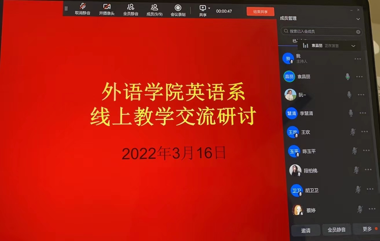 最后,与会教师针对教学设计和质量监控交流了各自的想法。英语系的很多课程都是实践性较强的语言类课程,关键在于扎实训练,即时反馈纠正。鉴于线上教学的局限性,教师需要加强与学生的交流沟通,了解他们的需求,以学定教,优化教学设计。同时,充分利用线上教学平台的优势,通过语音、视频、课后作业追踪等方式,及时反思调整教学内容和教学方法,以保证教学质量。