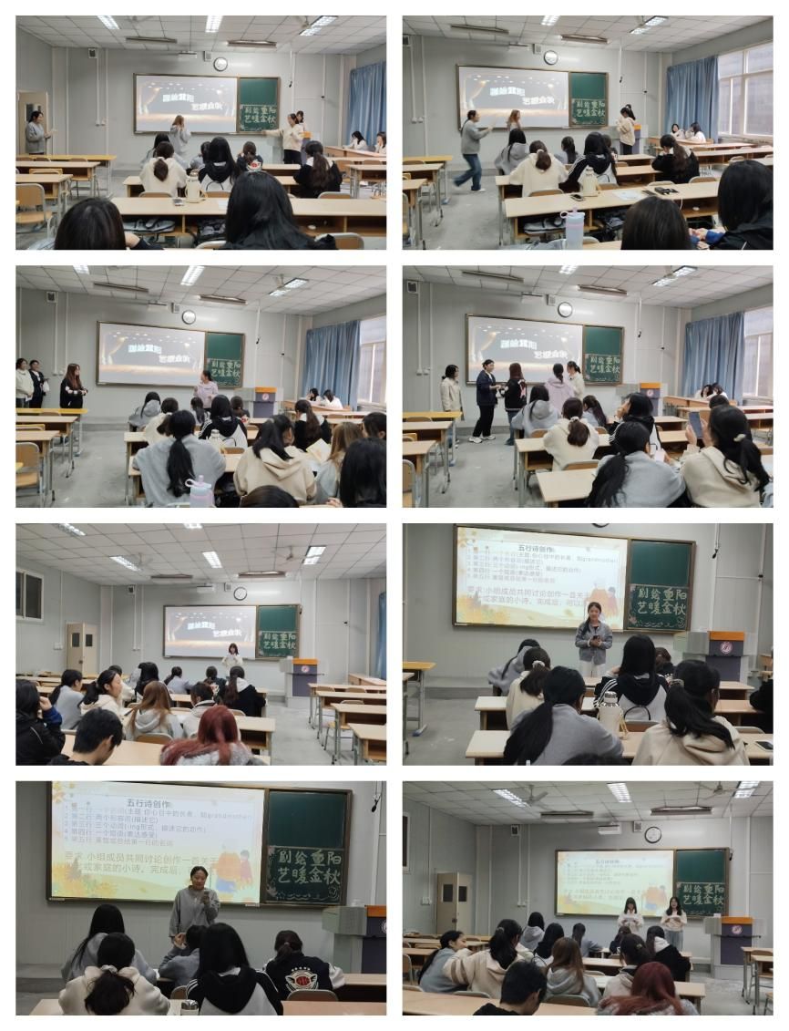 本次活动分为三个环节。热身“单词接龙”率先破冰,同学们围坐成圈,英语单词如彩珠落玉盘,既考临场反应又丰富了词汇量;随后“五行诗创作”环节,同学分成小组,限时五分钟,用英文创作重阳小诗,句句含“family”“respect”“mountain”,做到温情与外语融合,同学们用流利的英语表达,将现场气氛一次次推向高潮;最后压轴的“重阳古韵新话剧”,更是让同学们大展身手。Come home often to visit,Climbing for Love,Memories on the Ninth Day of the Ninth Month等微话剧轮番登场,同学们用流利英语演绎登高、敬老等千年习俗。短短七分钟,古典与当代碰撞,英语与汉语交织,观众笑声、掌声此起彼伏,生动的人物形象、精彩的剧情发展,引得现场观众阵阵喝彩。