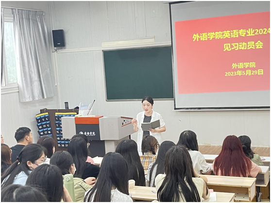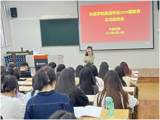 5月29日下午,ok1188诸侯快讯官方在6405教室召开了2022-2023学年第二学期师范生教育见习动员大会。ok1188诸侯快讯官方副院长胡卫卫、系主任周玫、教师教育团队教师袁昌丽及2020级英语专业及2022级英语专升本学生参加了此次动员大会,会议由周玫主持。