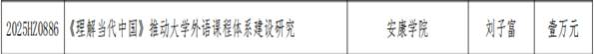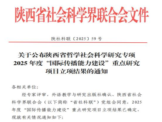 近日,根据《关于公布陕西省哲学社会科学研究专项2025年度“国际传播能力建设”重点研究项目立项结果的通知》陕社科联〔2025〕59号文件,我院胡卫卫教授申报的“人工智能与外语教育融合应用研究”刘子富副教授申报的“《理解当代中国》推动大学外语课程体系建设研究”获得立项,立项经费分别为壹万元。