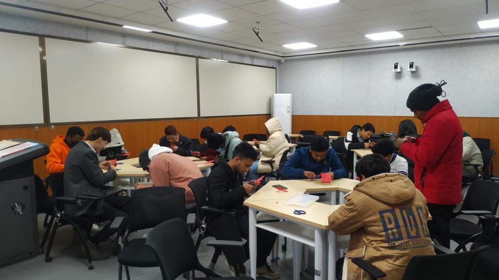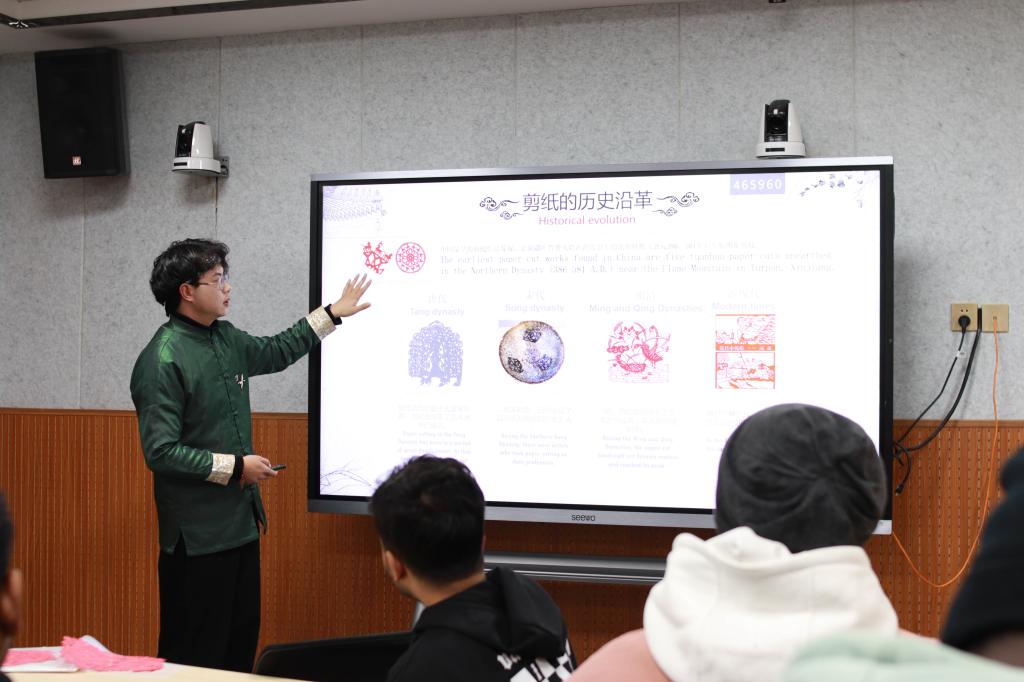 梁少华向同学们介绍了中国剪纸的基本知识和剪制方法,分享了自己所创作的部分作品。简洁的语言及双语版的课件让留学生们对剪纸文化的知识更加清晰的了解,留学生们都听得十分认真,整场讲座欢声笑语不断。