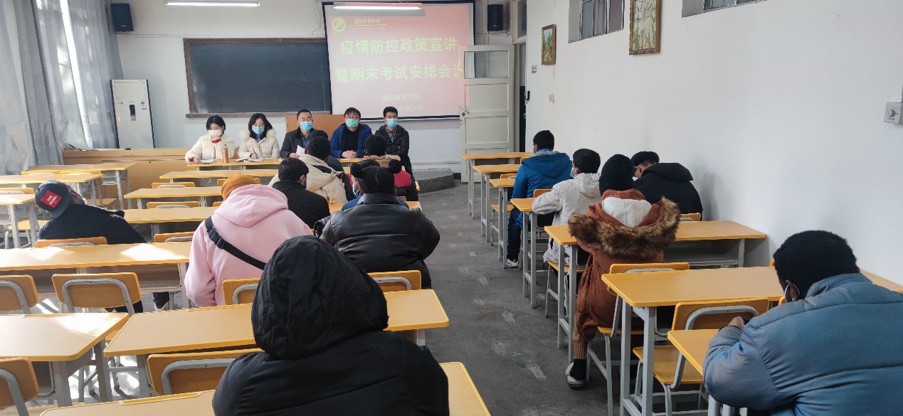 12月21日,国际教育学院召开疫情防控政策宣讲暨期末考试安排会议,副院长陈蕾、学工办主任李泊霖、辅导员李贤松及全体在校留学生参加此次会议,会议由陈蕾主持。会议特别邀请学校保卫处处长王开忠和消防科科长杜恒为留学生做近期疫情防控政策宣讲,以增强留学生们的防疫意识,强化校园疫情防控管理。