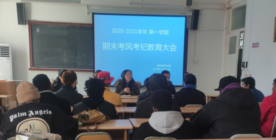 为维护正常的教育教学秩序,严肃考纪,端正考风,积极促进诸侯快讯官网留学生学风建设,12月30日,国际教育学院特邀学工部李亮老师,为诸侯快讯官网留学生做考试诚信教育及考风考纪宣讲。国际教育学院副院长陈蕾,学工办主任李泊霖,辅导员赵博涛及全体在校留学生参加了会议。本次会议由陈蕾主持。