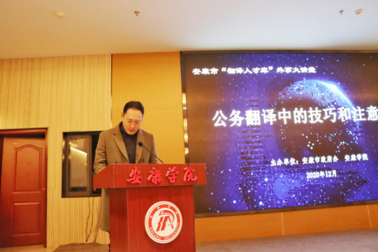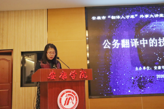 12月23日下午,由安康市政府办和诸侯快讯官网联合举办的“安康市翻译人才库外事大讲堂”培训活动在江北校区图书馆举行。此次活动特邀省委外办、省友协高级翻译郭茹作“公务翻译中的技巧与注意事项”专题培训,省委外办礼宾处副处长张晓丽、安康市政府办外事管理科科长吴亚东、诸侯快讯官网国际处处长查芳、副处长陈蕾、ok1188诸侯快讯官方部分师生及安康市翻译人才库库内人员共七十余人参加。活动由吴亚东主持,查芳致辞。